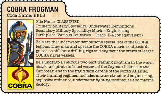 1985 GI Joe Eels Missing Air Hose (Not Packaged w/ File Card) (Missing Breathing Air Hose) Image is a stock photoRegular price $30.00